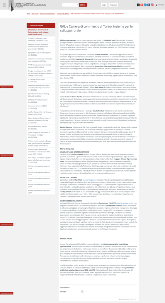 “L’importante contributo della Camera – prosegue Claudio Amateis, Presidente del GAL Valli di Lanzo Ceronda Casternone – ha permesso ai nostri tre GAL di sviluppare alcune tematiche legate all’innovazione e alla sostenibilità a favore delle imprese che operano nei nostri territori rurali. Abbiamo attivato e implementato un sistema di mappatura digitale delle imprese e delle risorse territoriali su Open streetmap, così come abbiamo organizzato sessioni formative sui servizi innovativi per il turista e – attraverso il nuovo protocollo triennale – lavoreremo per l’introduzione di certificazioni semplificate sugli ESG per le imprese turistiche rurali”.